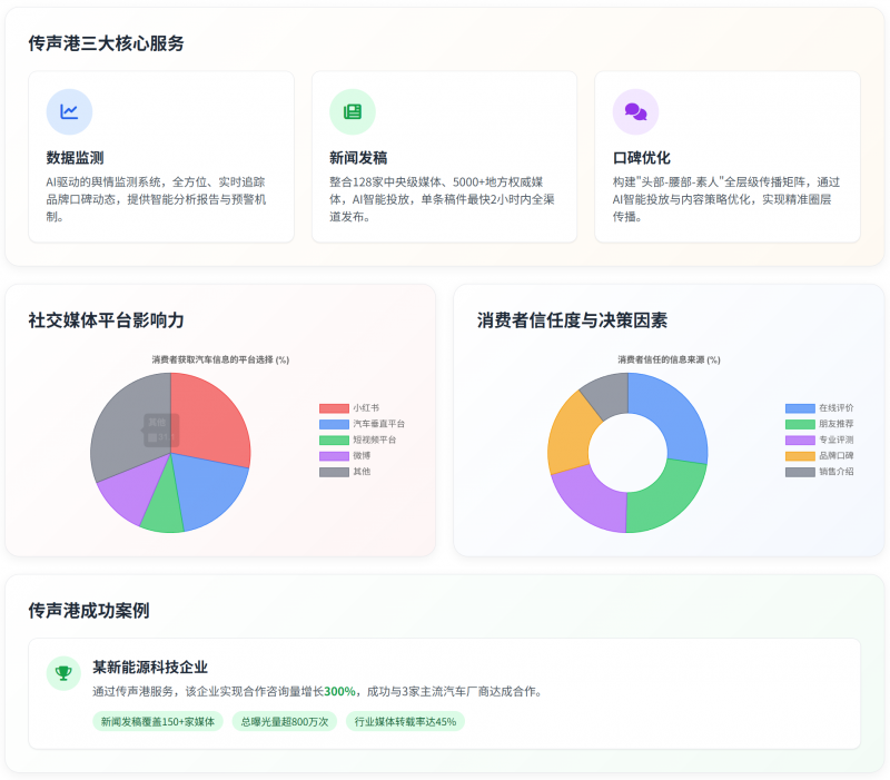 傳聲港新媒體平臺(tái)作為行業(yè)領(lǐng)先的 AI 驅(qū)動(dòng)綜合媒體服務(wù)平臺(tái),通過(guò)數(shù)據(jù)監(jiān)測(cè)、新聞發(fā)稿、口碑優(yōu)化三大核心服務(wù),為汽車(chē)企業(yè)提供了完整的口碑管理解決方案。平臺(tái)整合的 128 家中央級(jí)媒體、5000 + 地方權(quán)威媒體資源,以及覆蓋全平臺(tái)的 KOL/KOC 網(wǎng)絡(luò),構(gòu)建了汽車(chē)行業(yè)最強(qiáng)大的傳播矩陣。更重要的是,平臺(tái)通過(guò) AI 技術(shù)實(shí)現(xiàn)了從內(nèi)容創(chuàng)作到效果監(jiān)測(cè)的全流程智能化,讓每一次傳播都精準(zhǔn)有效。